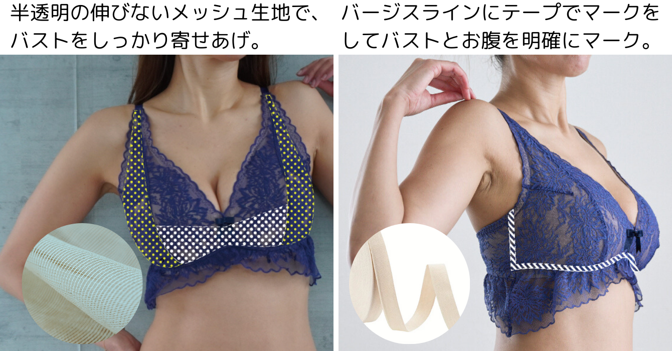 バストの形状保持とバストアップ効果の鍵となるのが、ノンワイヤーブラの設計です。従来のノンワイヤーブラは、丸く整形されたカップをバストにあてがうことで外見だけを整えるものが多く、サポート力が不足しがちでした。綺麗なバストをキープするには、バストを正しい位置にキープするためのパネルや、バスト位置をきちんとマークする構造が重要です。正しいサイズ選びのポイント